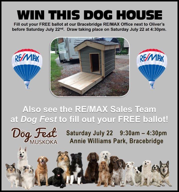 The RE/MAX Sales Team in Bracebridge held a draw for this custom build $1000 value dog house at the NEW Muskoka Dog Fest held at Annie Williams Park in Bracebridge. The first year was a huge success, with over 2000 visitors the organizing group was able to donate $8,500 to charity.