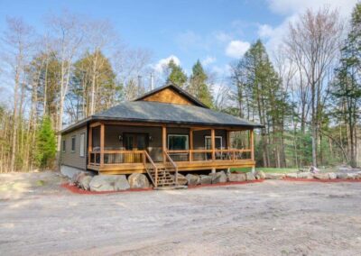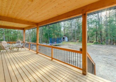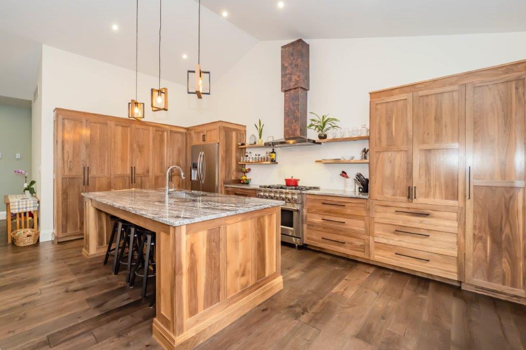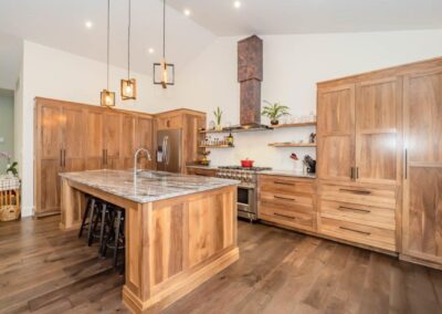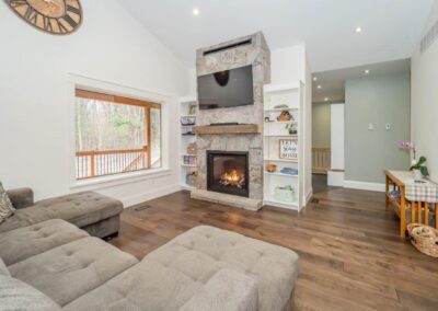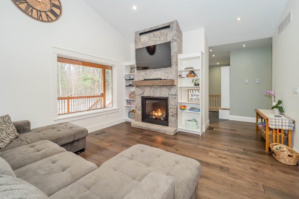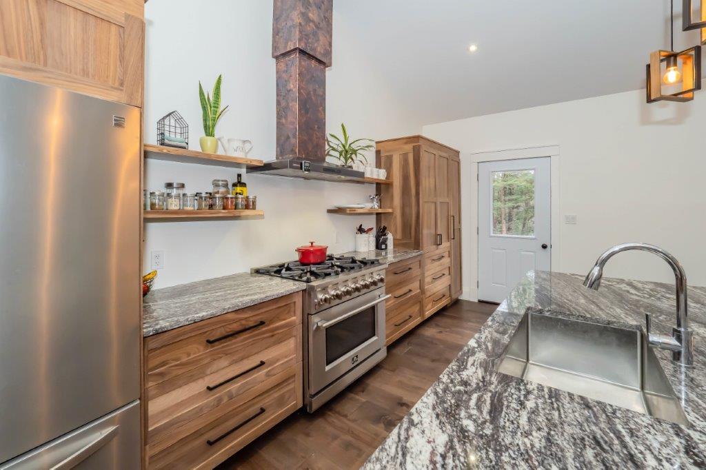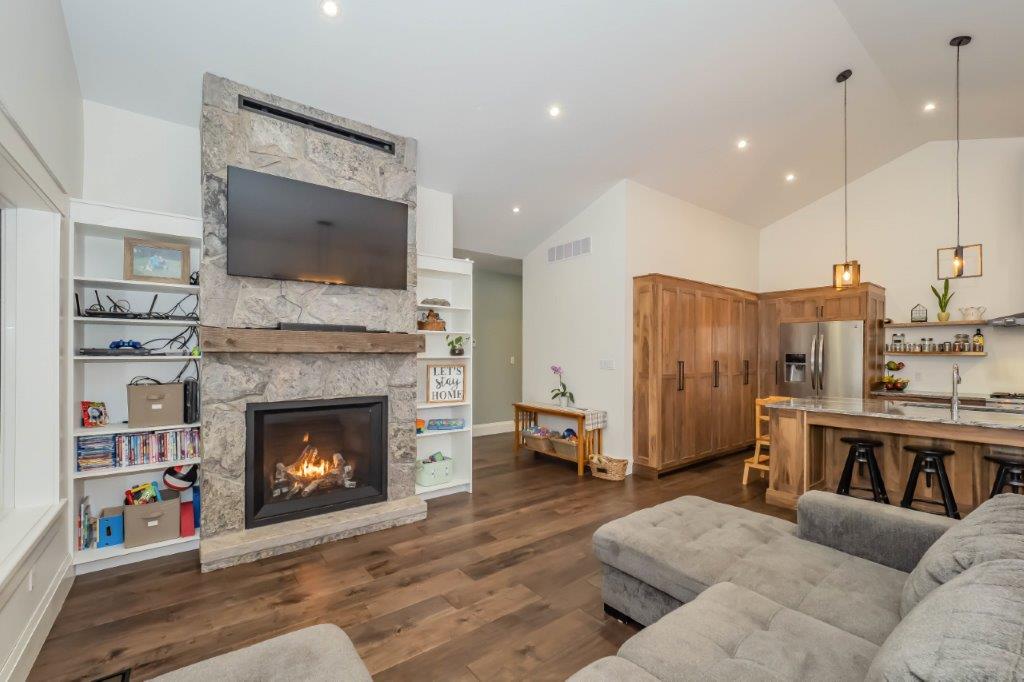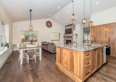 #1 – THE GREAT ROOM: The 25×22 Great Room features a vaulted ceiling, custom walnut kitchen cabinetry and island, finer finishings, so much natural light, and floor to ceiling granite fireplace with a mantel from the property itself! There’s a walkout from the kitchen for a side deck, and the dining area patio doors lead to the covered veranda.