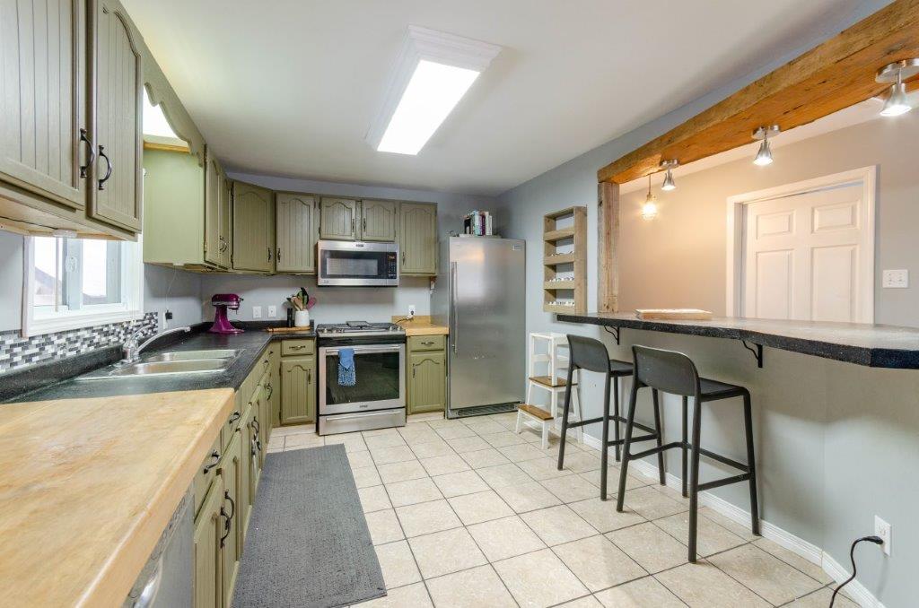 Some other great features include: main floor laundry, forced air oil furnace (new oil tank in 2019), 200-amp hydro service, wired for a generator, shingles replaced in 2019, and drilled well. NEW IN 2020: woodstove and chimney in the living room; microwave rangehood; propane stove/oven; propane tank (owned). The detached 16×23 shop/garage-type building has hydro, a storage loft, and is on a concrete pad.