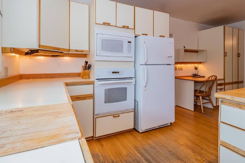 The 1,440 sqft main floor, with wood floors, offers an open concept living and dining area with direct access to the patio, an eat-in kitchen, 20×19 family room with vaulted ceiling, a private den or home office, 2pc powder room, and direct access to the attached garage.